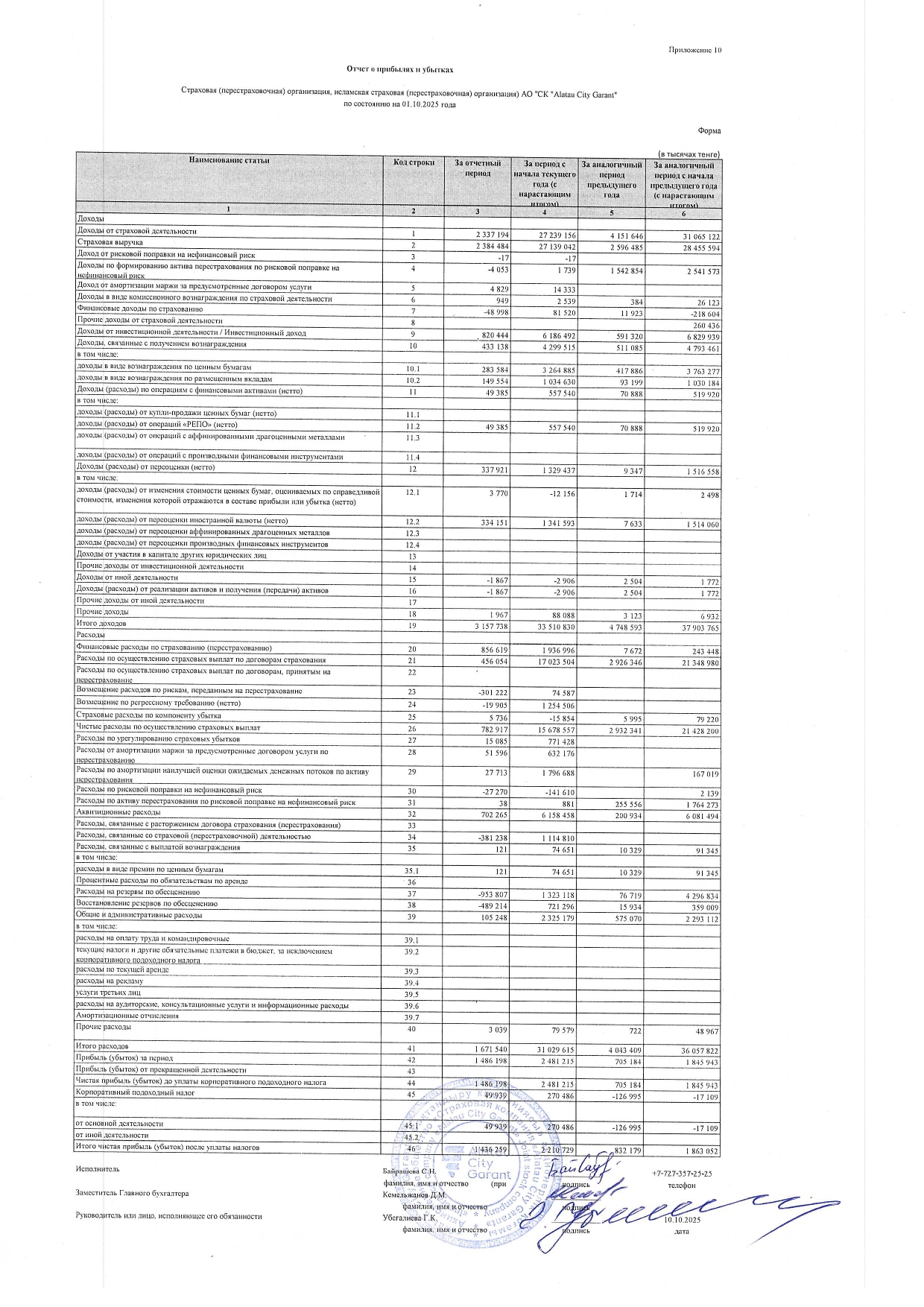 Бухгалтерский баланс и отчет о прибылях и убытках страховой (перестраховочной) организации, исламской страховой (перестраховочной) организации АО «СК «Alatau City Garant» по состоянию на 1.10.2025 года.