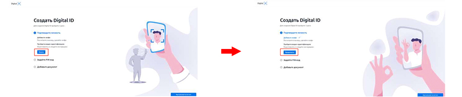 - Создать Digital-ID (архив с фото и видеоданными, подтверждающими личность пользователя). После нажатия кнопки «Нажать» необходимо сделать фото-селфи. Для этого на экране появится область, в рамках которой необходимо разместить лицо пользователя, сделать снимок и нажать «Отправить». Некорректное изображение можно заменить до отправки, нажав на кнопку «Попробовать еще раз».