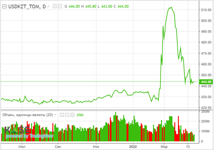 - По итогам торгов в пятницу, 22 апреля, средневзвешенный курс тенге к доллару США практически не изменился и составил 444,09 тенге за доллар (+0,02 тенге). Объем торгов по-прежнему остается низким – $68,9 млн (+$8,7 млн) при среднесуточном значении текущего года $145,1 млн.
