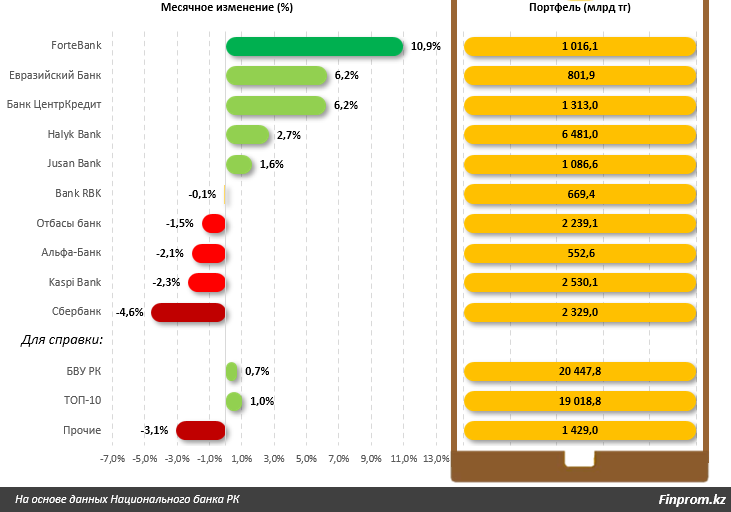Среди банков, сохранивших кредитную активность, с большим отрывом лидирует ForteBank: сразу плюс 10,9% за месяц, до 1,02 трлн тг. В годовой динамике у банка также отличные показатели роста: плюс 30,9% — выше, чем в целом по сектору (плюс 29,5%).