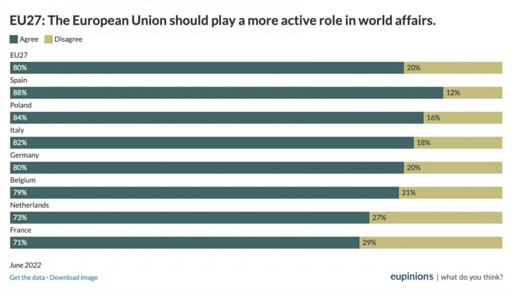 Европейцы хотят, чтобы ЕС играл более значительную роль на мировой арене. Аналогичная картина складывается и в отношении поддержки расширения ЕС. Явное большинство европейцев выступает за принятие Украины в ЕС (66 процентов в целом по ЕС).