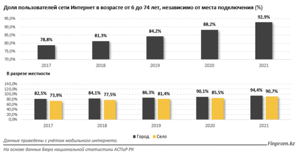 Согласно статистическим данным, в 2021 году доля пользователей Интернета в возрасте от 6 до 74 лет в Казахстане составила 92,9%. Это на 4,7 процентных пункта больше, чем в 2020 году. Кроме того, наблюдается сокращение разрыва между сельской и городской местностью — показатель вырос с 85,5% до 90,7% в сельской местности и с 90,1% до 94,4% в городской, сократив разрыв на 4,6 процентных пункта.