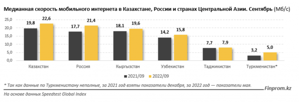 Медианная скорость мобильного интернета в Казахстане достигла 22,6 Мбит/с в сентябре этого года, что на 14,5% выше, чем в прошлом году, сообщает Bizmedia.kz.