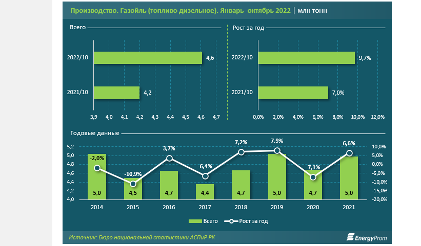 Стоимость дизельного топлива сильно выросла за последний год — на 13% в целом, и на 31% для зимнего дизельного топлива. В этом году в стране было произведено 4,6 млн тонн дизельного топлива — на 9,7% больше, чем в прошлом году. В целом за 2021 год производство в стране увеличилось на 6,6% и достигло 5 млн тонн дизельного топлива, пишет Energyprom.kz.