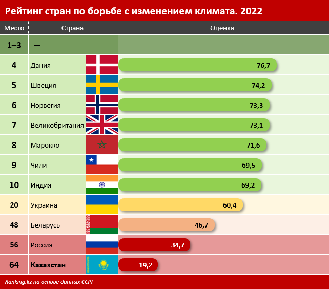 Несмотря на рост капвложений в экологию, в рейтинге стран по борьбе с изменениями климата Казахстан в 2022 году занял последнюю строчку среди участвующих 64 стран. За год Казахстан потерял сразу 9 позиций. Оценка страны составила всего 19,23 балла из 100.