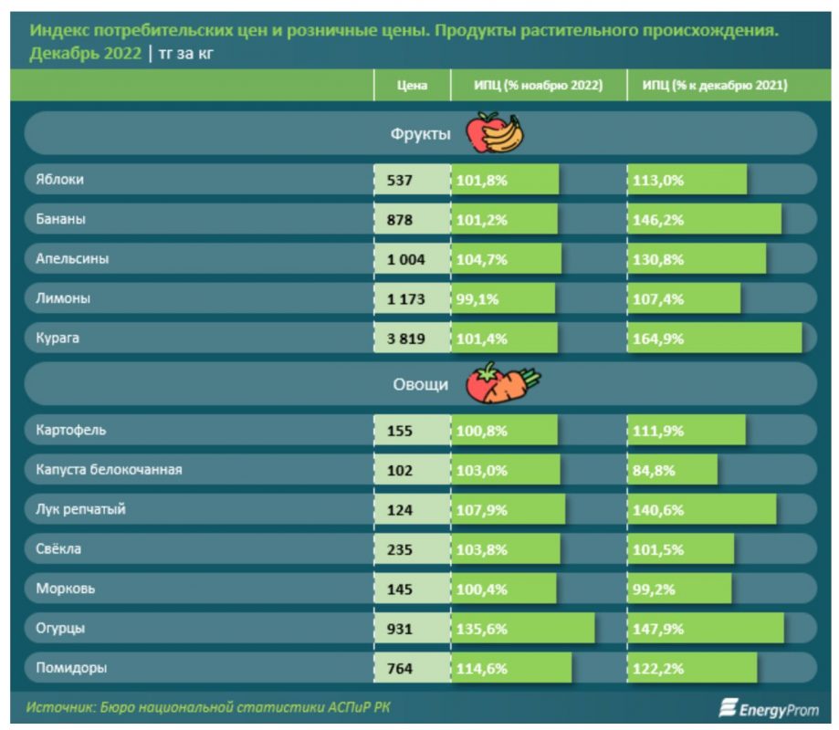 За прошедший год цены на фрукты выросли, причем наибольший скачок цен произошел на абрикосы — на 64,9% или до 3,8 тыс. тг за кг, в результате чего их цена выросла до 3 800 тг за кг. Не отставали от них и бананы, подорожавшие на 46,2% до 878 тг за кг, за ними следуют апельсины с наценкой в 30,8% или до 1 тыс. тг за кг), яблоки (на 13%, до 537 тг за кг), лимоны (на 7,4%, до 1,2 тыс. тг за кг).