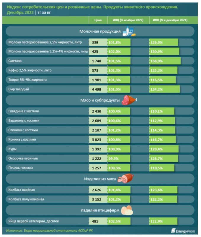 В конце декабря 2022 года цены на продукты питания резко выросли за последний год. Месячное изменение составило 1,6%, а годовое изменение — 25,3%. Об этом сообщает Bizmedia.kz со ссылкой на исследование Energyprom.kz.