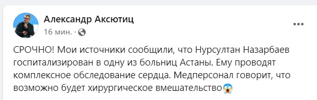 СРОЧНО! Мои источники сообщили, что Нурсултан Назарбаев госпитализирован в одну из больниц Астаны. Ему проводят комплексное обследование сердца. Медперсонал говорит, что возможно будет хирургическое вмешательство, — пишет Аксютиц.