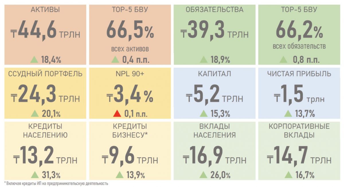 В последние два года наблюдался резкий рост объемов выдачи кредитов и общего остатка кредитного портфеля, который рос двузначными темпами, несмотря на резкое повышение базовой ставки с 9,75% до 16,75%. Этот скачок означал, что безрисковые инвестиции, такие как краткосрочные ноты Национального банка Казахстана и облигации Министерства финансов, предлагают высокие цены.