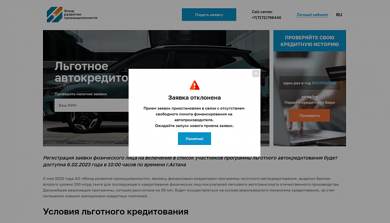 В последнем случае вы получите следующее сообщение: «Заявка отклонена. Прием заявок приостановлен в связи с отсутствием свободного лимита финансирования на автопроизводителя. Ожидайте запуск нового приема заявок».