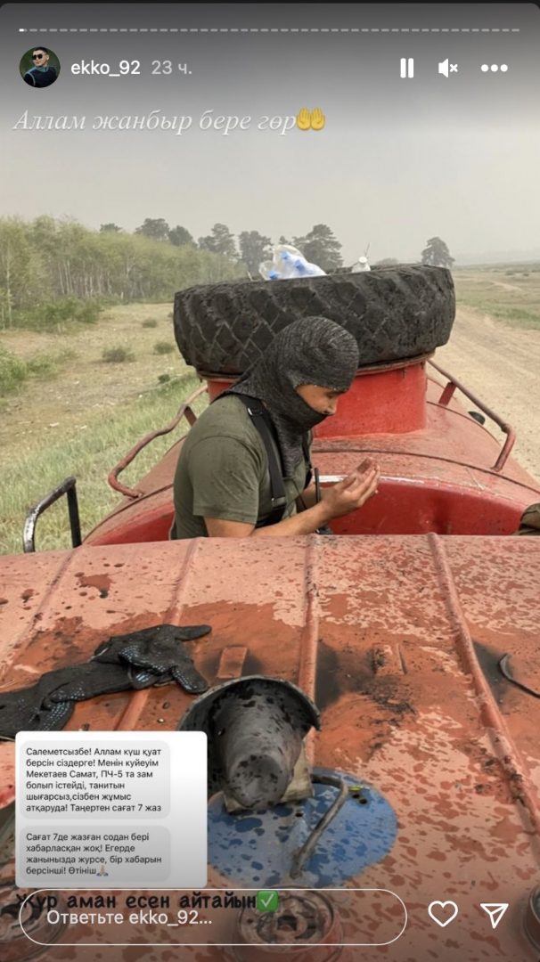 Пожарный Елдос Нуртазаев выкладывает на своей странице в Instagram видео и фотографии, снятые от первого лица. На одной из этих фотографий изображен его коллега, который молится, чтобы в регионе пошел дождь. Вероятнее всего молодые люди находятся на месте происшествия, чтобы помочь в борьбе с огнем, возможно, доставляя воду.