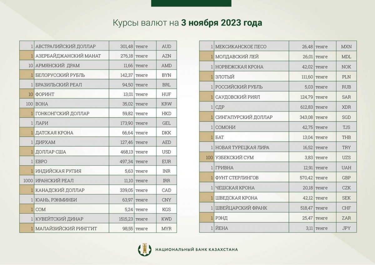 Национальный банк Казахстана опубликовал официальный курс тенге на 3 ноября 2023 года по отношению к другим мировым валютам, таким как доллар США, российский рубль и евро, сообщает Bizmedia.kz.