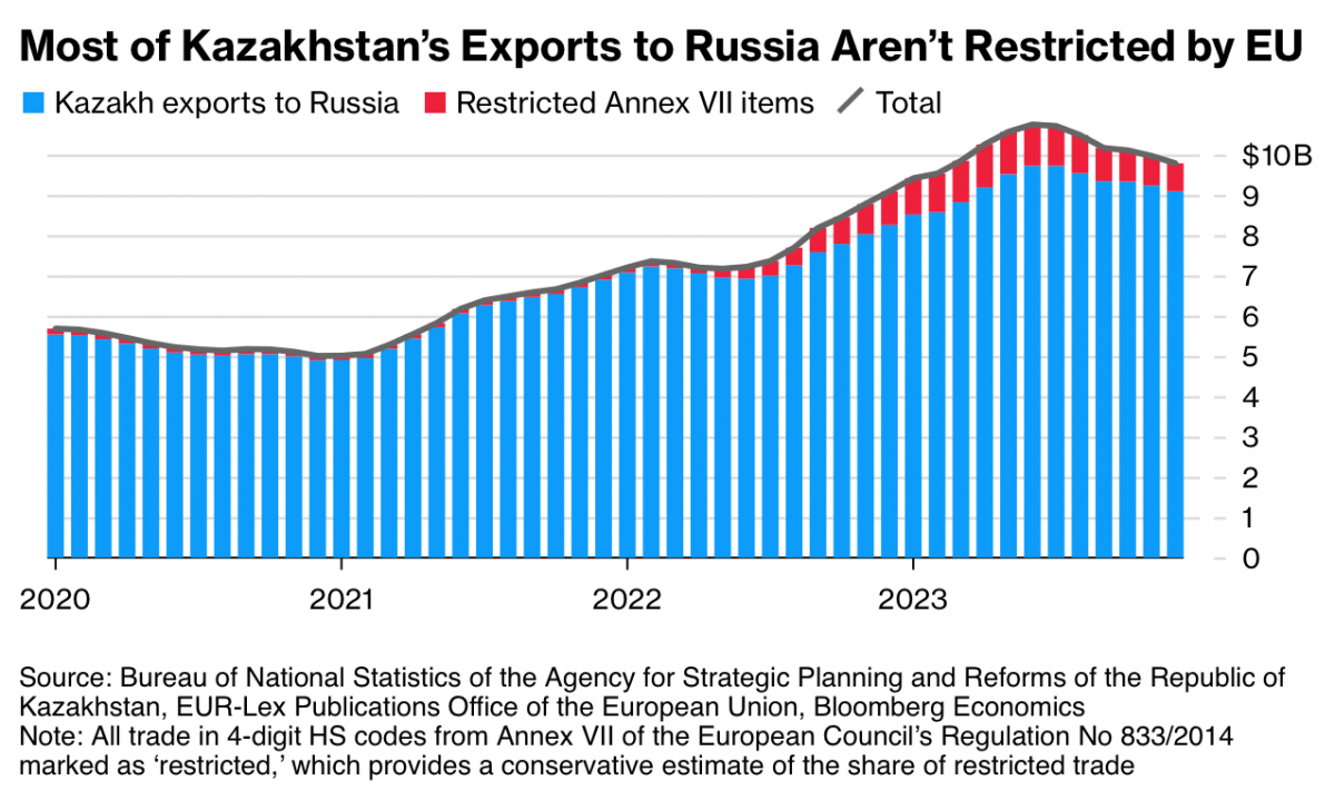 Несмотря на то, что Москва получает запрещенные товары из Европейского союза, исследование Bloomberg показало, что лишь 7% роста продаж товаров из Казахстана в Россию в 2023 году могут быть связаны с такими товарами. Среди других категорий увеличившегося экспорта отмечаются инструменты и автомобили. Санкции ЕС включают в себя самолеты, огнестрельное оружие и некоторые полупроводники.