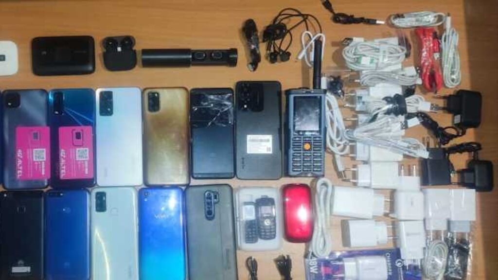 В ходе инспекции машины в салоне обнаружили технику, не предназначенную к ввозу на территорию — 19 мобильных телефонов разных моделей, семь комплектов наушников, 18 устройств для зарядки, четыре роутера для интернета, восемь SIM-карт и предмет, схожий с радиостанцией.