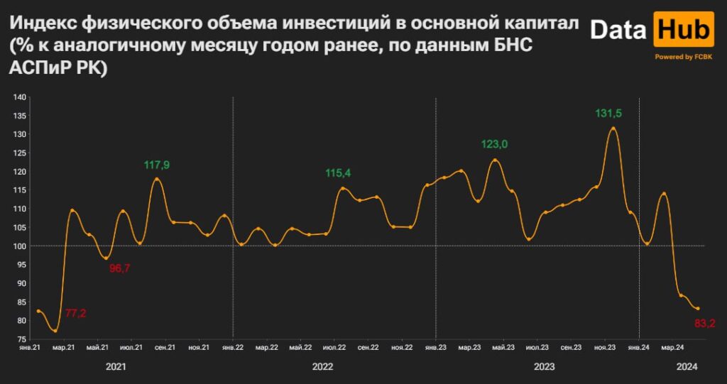 В прошлом месяце объем вложений в сопоставимых ценах снизился на 16,8% по сравнению с апрелем 2023 года. Это уже второе подряд падение (в марте было -13,3%), а также самое заметное с февраля 2021 года, сообщает Bizmedia.kz.