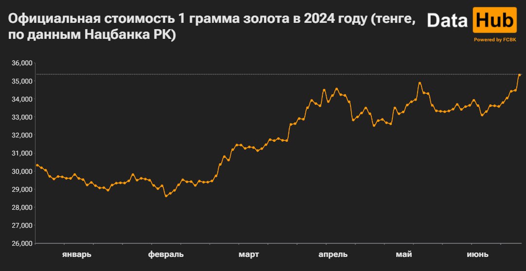 На 24 июня цена за грамм драгоценного металла достигла рекордных 35,3 тыс. тг, что является максимальным значением в статистике Нацбанка, начиная с 2017 года, передает Bizmedia.kz со ссылкой на DataHub.