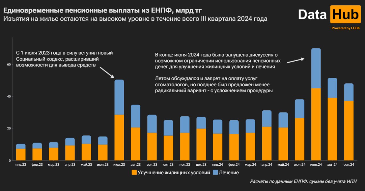 Сумма изъятий уже значительно отстает от июльского пика в 45,1 млрд тенге, но остается на уровне августа и превышает среднее значение первого полугодия на 88%. Текущие 37,1 млрд тенге, из которых 37% составляют окончательные расчеты за покупку жилья.