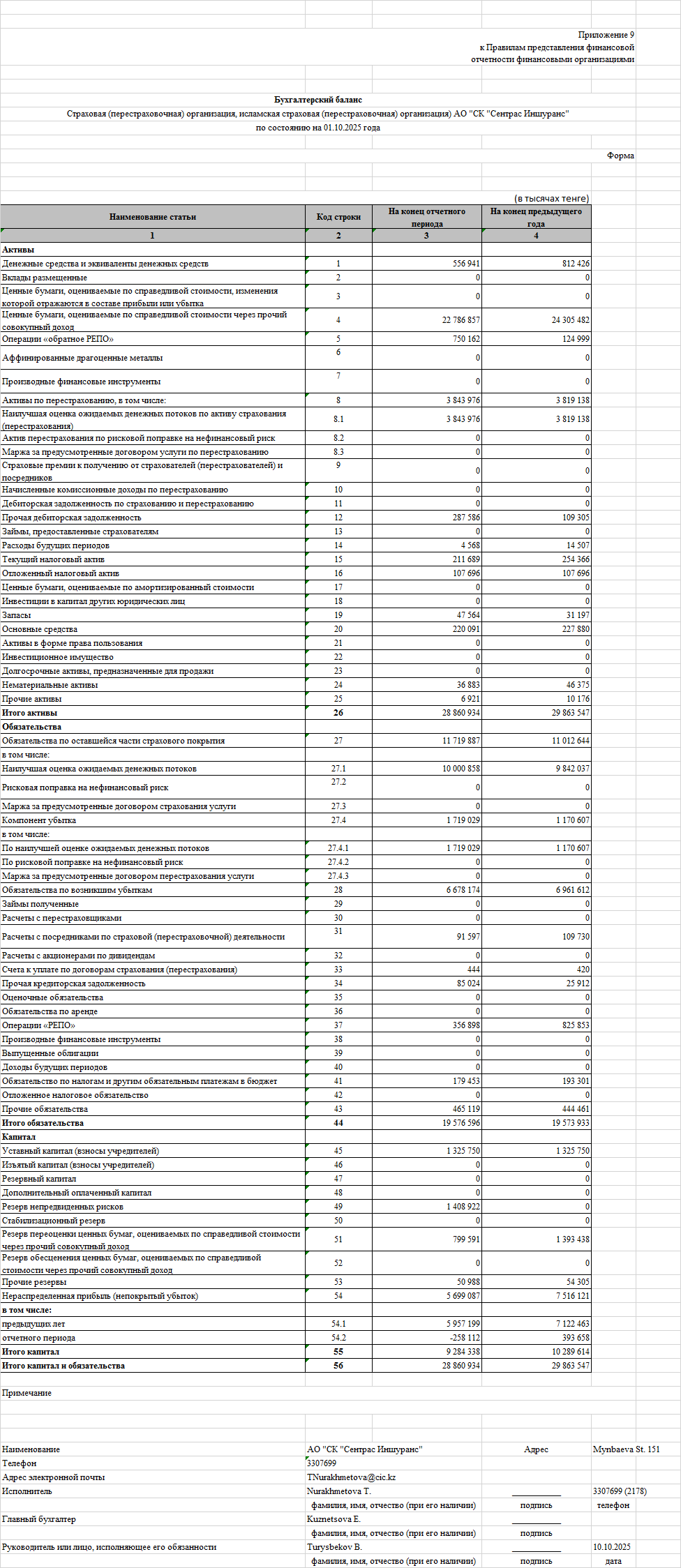 Bizmedia.kz публикует бухгалтерский баланс и отчет о прибылях и убытках страховой (перестраховочной) организации, исламской страховой (перестраховочной) организации) АО «СК «Cентрас Иншуранс» по состоянию на 01.10.2025 года.