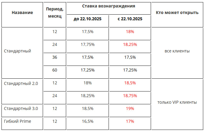 Для VIP-клиентов ставки стали ещё щедрее. По «Стандартному 2.0» на 12 месяцев теперь дают 18,5%, на 24 месяца — 18,75%. А по «Стандартному 3.0» можно получить до 19% годовых. Есть и вариант для тех, кто хочет больше гибкости — «Гибкий Prime»: ставка выросла с 16,5% до 17%.