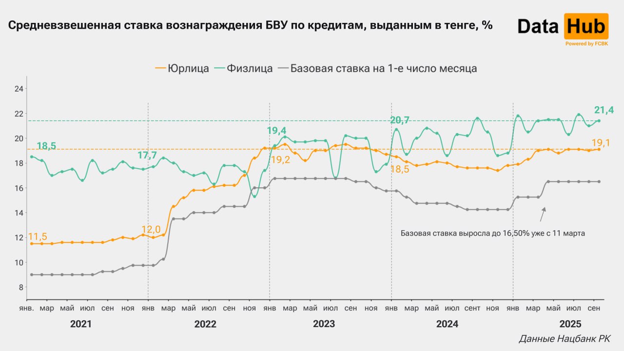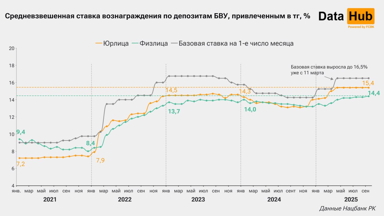 В сентябре 2025 года средняя ставка по тенговым депозитам населения выросла с 14,3% до 14,4%, поставив новый максимум за последние двадцать с лишним лет.