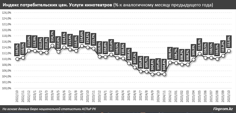 По информации Бюро национальной статистики АСПиР РК, которую приводит Finprom.kz, в октябре 2025 года стоимость разового посещения кинозала оказалась выше на 12,9% по сравнению с прошлым годом. Ускорение роста фиксируется с начала осени, и подобная тенденция повторяется уже второй год подряд. Наибольшие скачки цен на билеты традиционно приходятся на октябрь–декабрь, когда посещаемость кинотеатров возрастает.