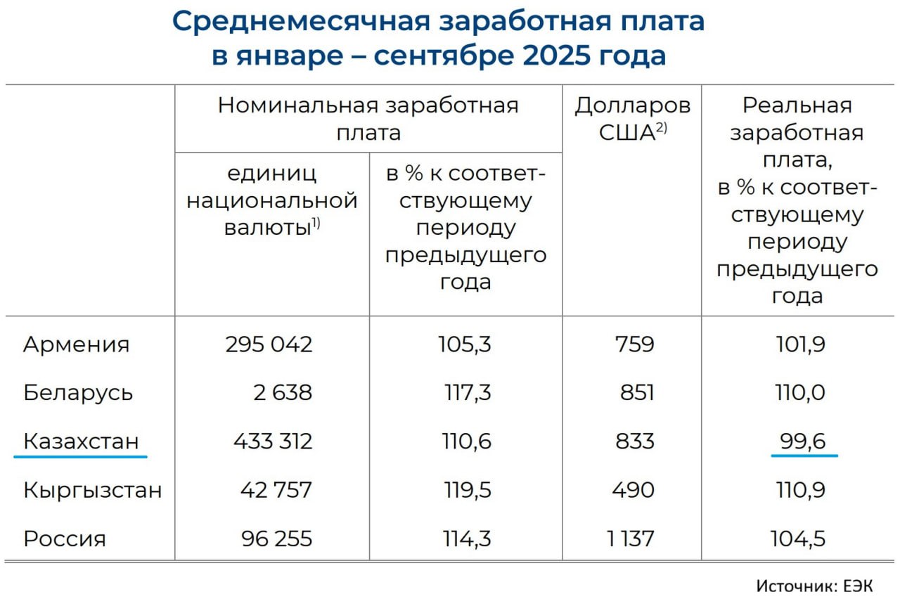 По данным Евразийской экономической комиссии (ЕЭК), в январе–сентябре 2025 года Казахстан стал единственным государством в ЕАЭС, где реальные зарплаты показали снижение, сообщает Bizmedia.kz.