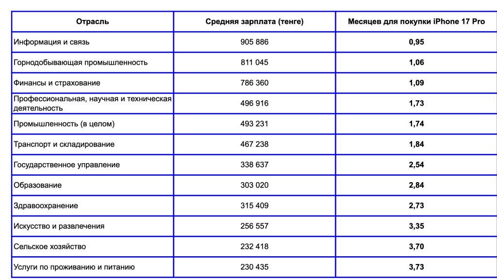 По данным БНС, средняя зарплата в Казахстане в 2024 году составила 384 266 тенге. То есть среднестатистическому казахстанцу придётся откладывать всю зарплату 2,2 месяца, чтобы купить iPhone без кредитов. На практике только IT, финансовый и нефтегазовый секторы могут позволить себе смартфон сразу. Для большинства остальных — это покупка на уровне 2–3 зарплат, а в некоторых регионах — ещё сложнее.