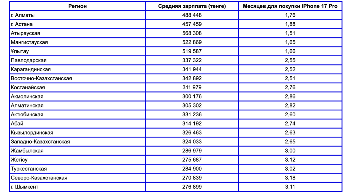 Региональная картина тоже интересная: в Атырау, Мангистау и Ұлытау, где экономика строится на добыче, iPhone стоит примерно полторы зарплаты. В Алматы и Астане — почти 1,8 зарплаты. Южные и северные регионы вроде Жетsсу, Туркестанской и Северо-Казахстанской показывают наибольшие трудности: там смартфон равен 3 и более зарплатам, и без рассрочки обойтись сложно.