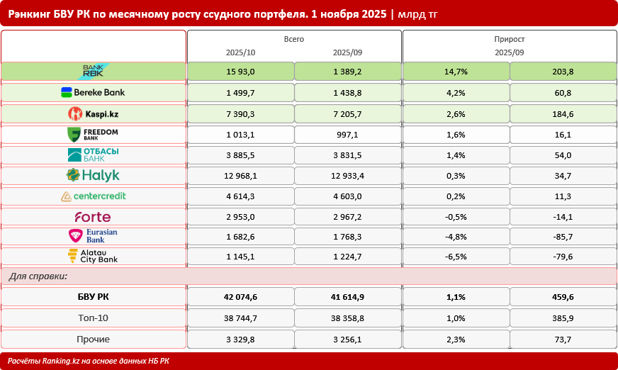 Абсолютный лидер по месячному росту — Bank RBK, увеличивший портфель займов сразу на 14,7%, до 1,59 трлн тг. В стоимостном выражении рост составил 203,8 млрд тг, это рекорд по всему сектору. С начала года рост ссудного портфеля в банке достиг уже 41,7%, при общем росте в среднем по сектору лишь на 17,4%.