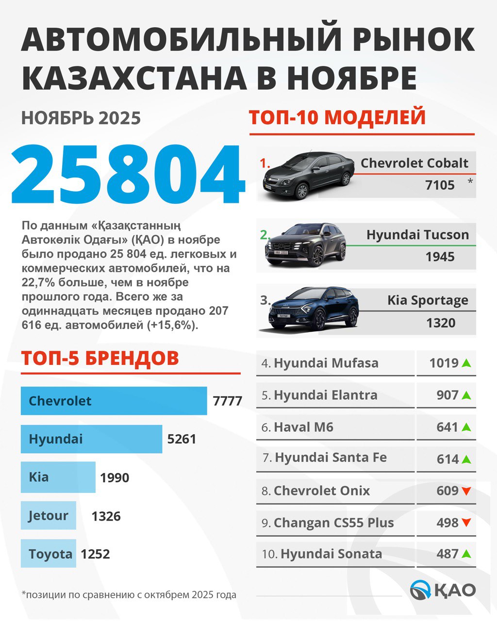 В ноябре 2025 года в Казахстане продано, по данным Казахстаннын Автокелик Одагы, 25 804 автомобиля. Это число на 22,7% превышает данные ноября 2024 года.