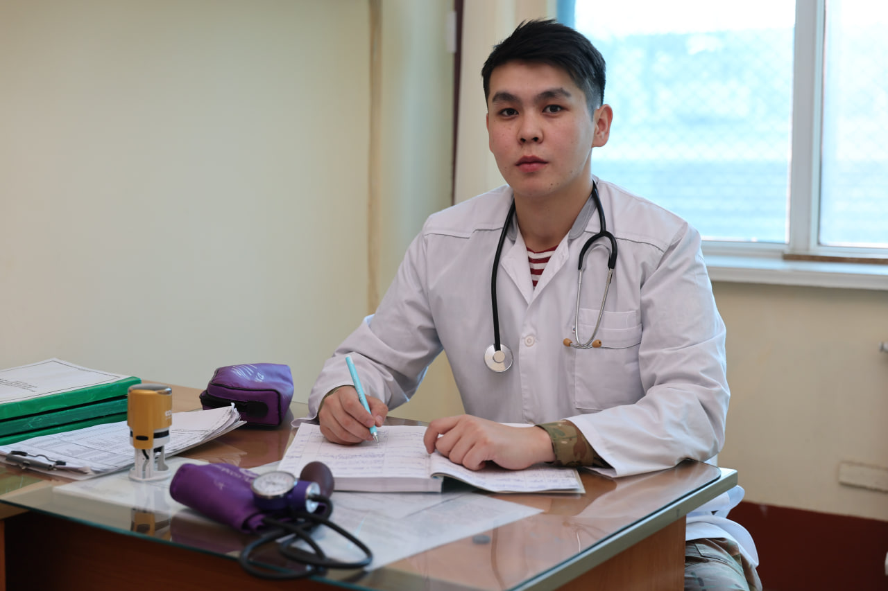 Балгын Айдын, 25 лет, был призван на срочную службу из Талдыкоргана и прибыл в часть 5513 города Тараз уже с серьёзным профессиональным багажом. За плечами — семь лет обучения в Семейском медицинском университете и диплом врача-терапевта.