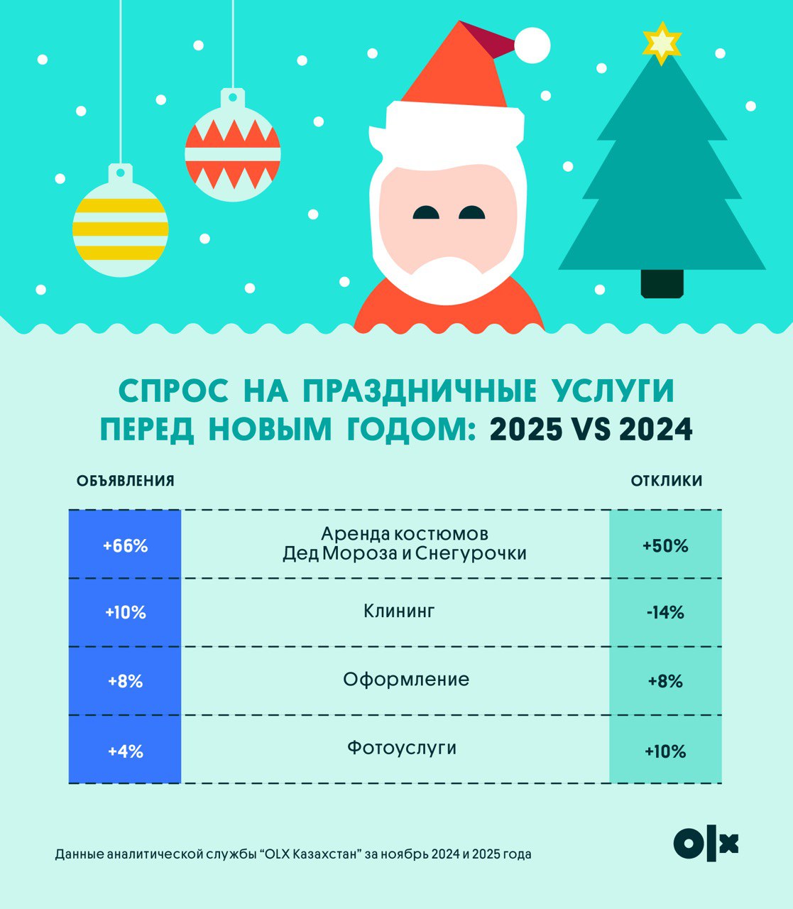 Декабрь традиционно становится самым напряженным месяцем года. Помимо рабочих дедлайнов и предпраздничной суеты, на плечи многих ложится организация Нового года – от генеральной уборки до поиска фотографа, костюмов и праздничного декора. Неудивительно, что спрос на сервисные услуги в этот период резко растет. Аналитическая служба OLX Казахстан собрала данные, какие услуги особенно востребованы перед праздниками, сколько они стоят и как выбрать надежного исполнителя.