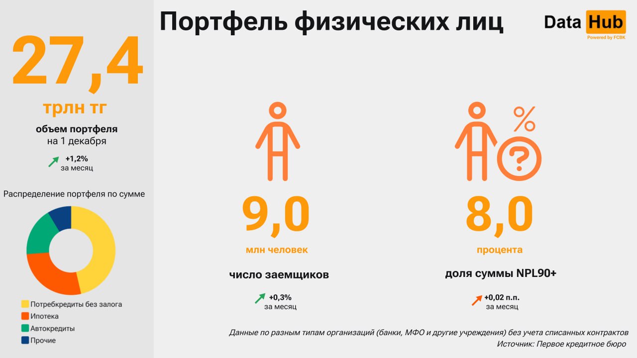 Общий объём займов, выданных физическим лицам, составил 1,4 трлн тенге. Это на 1,7% меньше, чем месяцем ранее. Этот результат стал минимальным с марта текущего года.