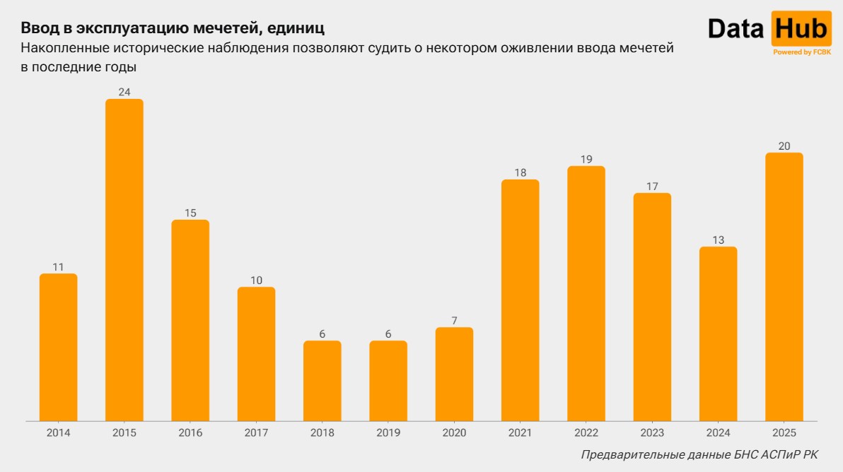В 2025 году в Казахстане открыли сразу 20 новых мечетей — это на 54% больше, чем годом раньше. Больше такого количества не строили с 2015 года, когда ввели 24 мечети. Об этом сообщает Bizmedia.kz со ссылкой на DATA HUB.