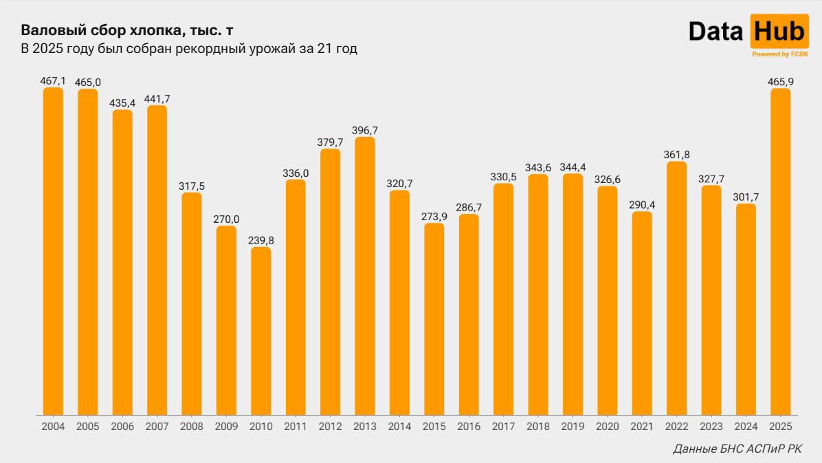 В 2025 году в Казахстане собрали 465,9 тыс. тонн хлопка, теперь это самый высокий показатель за 21 год. Об этом сообщает DATAHUB, передает Bizmedia.kz.