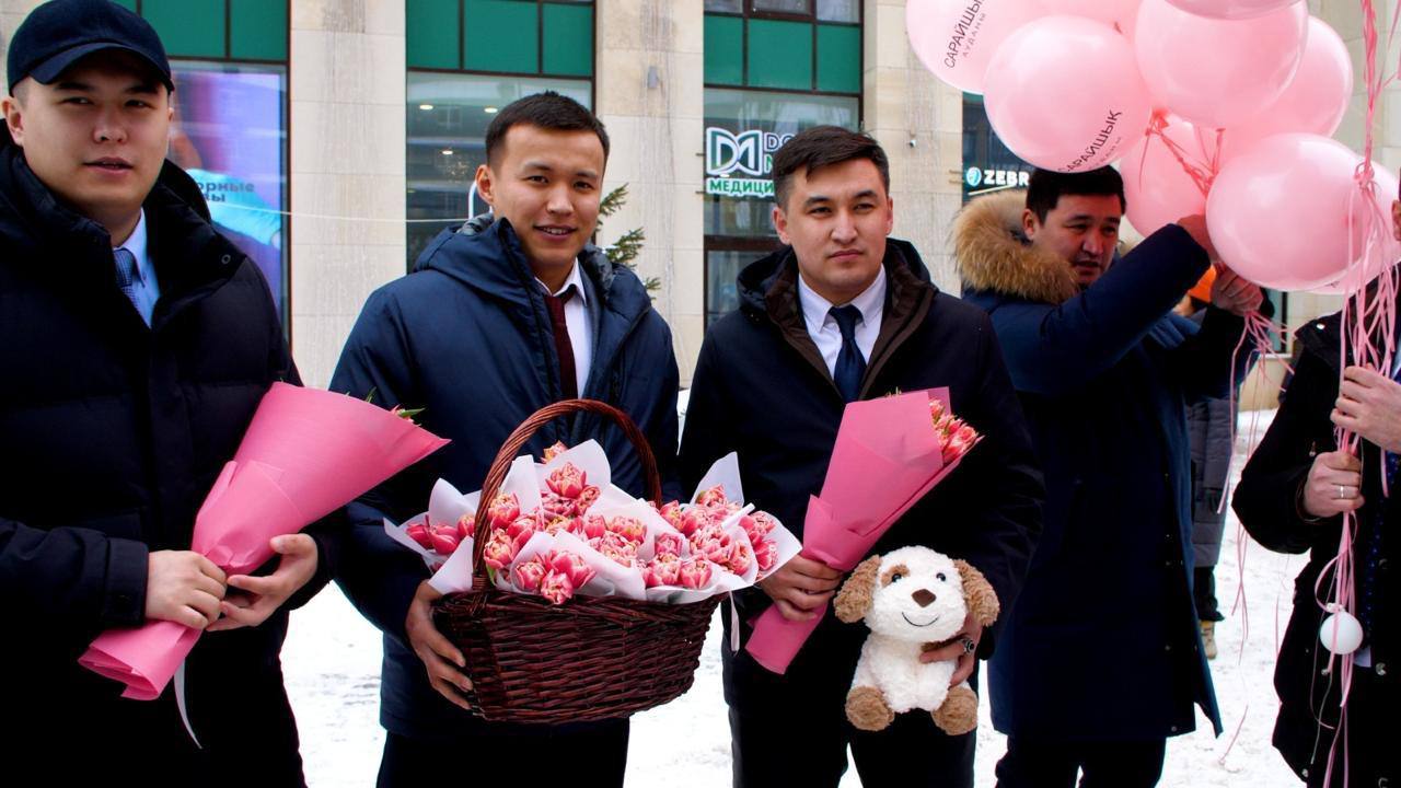 Сотрудники акимата поздравляли прохожих женщин с праздником и вручали им тюльпаны.