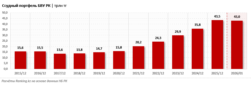 По итогам 2025 года ссудный портфель казахстанских банков второго уровня достиг рекордных 43,5 трлн тг, увеличившись на 21,3%. За пять лет показатель вырос почти втрое, – сообщает Ranking.kz со ссылкой на данные НБ РК.