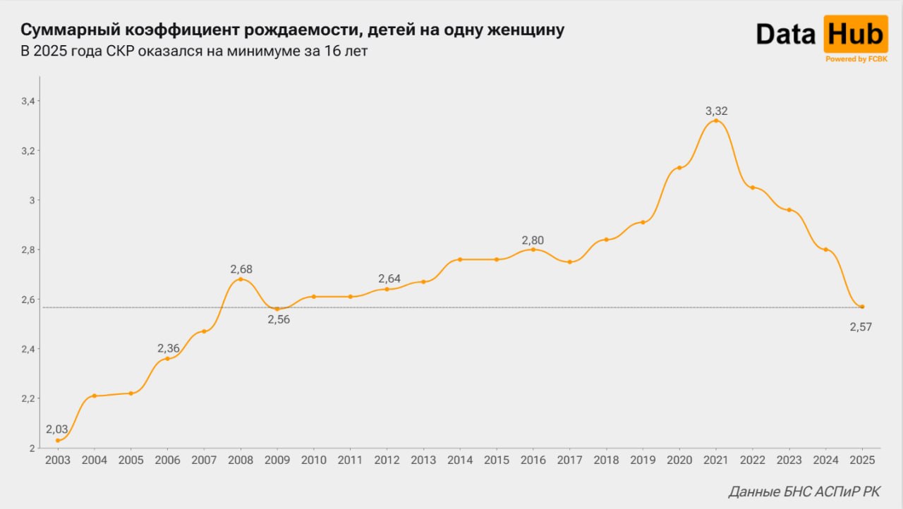 В Казахстане зафиксировано снижение уровня рождаемости, сообщает DATAHUB. По итогам 2025 года показатель опустился до минимального значения за последние годы, передает Bizmedia.kz.