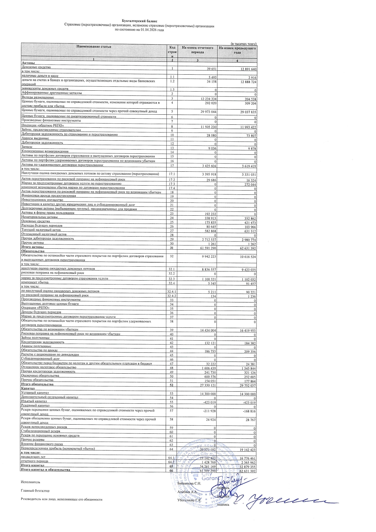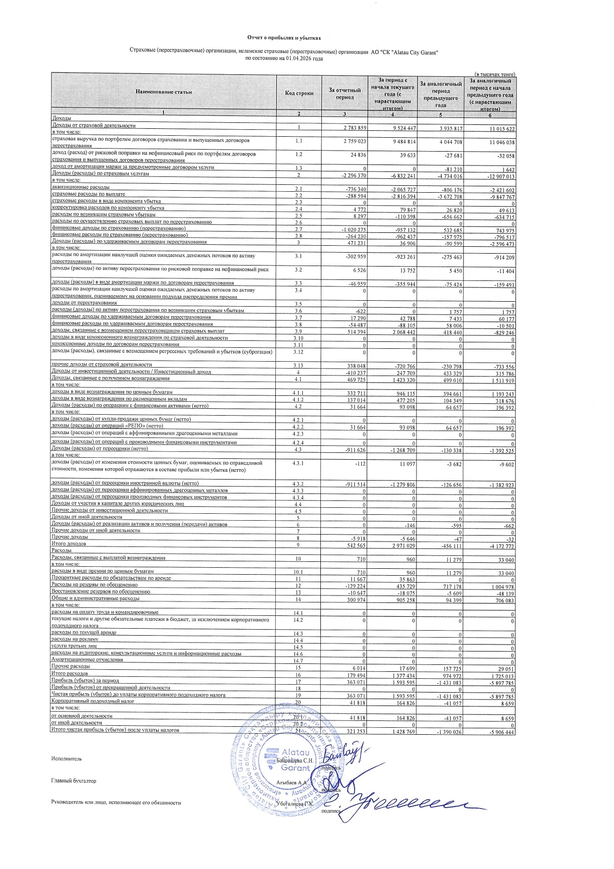 Бухгалтерский баланс и отчет о прибылях и убытках страховой (перестраховочной) организации, исламской страховой (перестраховочной) организации АО «СК «Alatau City Garant» по состоянию на 01.04.2026 года.
