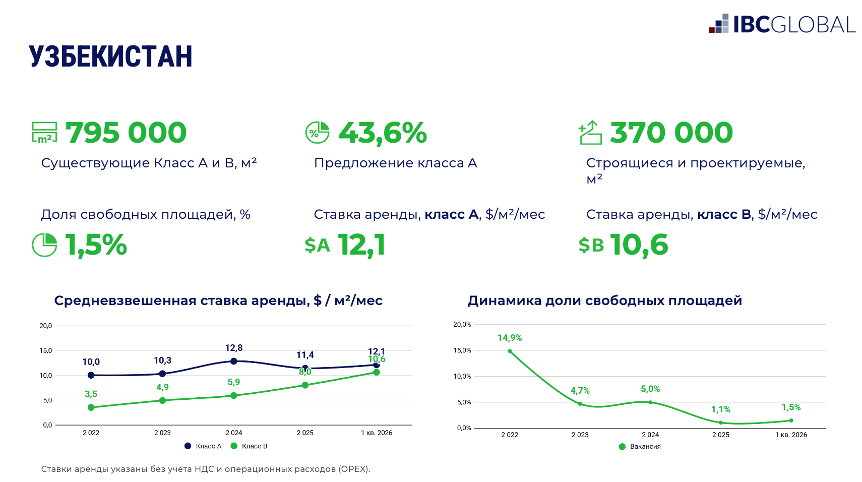 Складской рынок Узбекистана на данный момент является одним из самых дефицитных в мире. По данным, представленным IBC Global, совокупный объем предложения качественных складов классов А и В в стране составляет 795 000 м2. В регионе фиксируются растущие ставки аренды (порядка 12$ /м2/мес, а в классе В $10,6/м2/мес без ОРЕХ и НДС что выше ставок в Нью-Йорке), острый дефицит качественного предложения (сейчас нехватка качественной складской инфраструктуры составляет почти 400 тыс м2). Доля класса А достигла 43,6% и продолжает расти. Вакансия в сегменте А на уровне математической погрешности 1,5%, что является классическим «рынком арендодателя» с вымыванием предложения площадей на стадии проектирования.