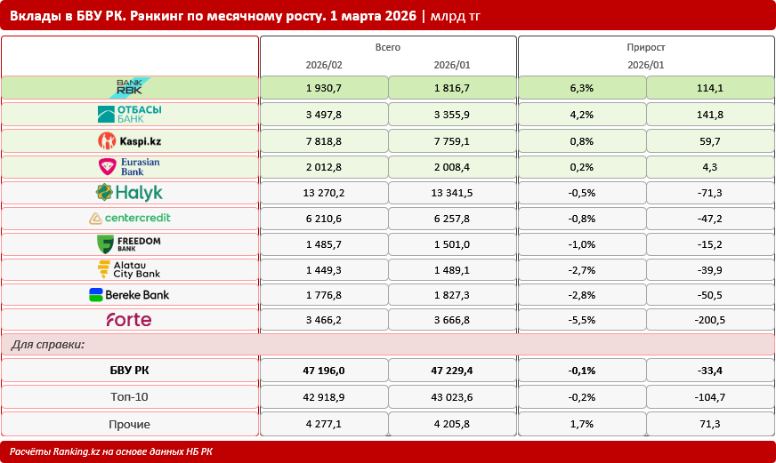 На 1 марта 2026 года вклады в казахстанских банках составили 47,2 трлн тг — на 0,1% (или на 33,4 млрд тг) меньше, чем месяцем ранее. В топовой десятке банков — держателей вкладов в плюсе оказались лишь 4 БВУ, – сообщает Ranking.kz со ссылкой на данные Национального Банка РК